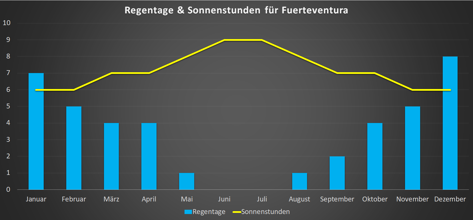 In den Sommermonaten klettert das Thermometer dann auf 26 bis 28 °C und man darf sich auf 9 Sonnenstunden pro Tag freuen. Die Wassertemperaturen liegen zwischen 23 und 24 °C, sodass diese Jahreszeit ideal für einen Badeurlaub geeignet ist. Von Juni bis August fallen auf Fuerteventura keine Niederschläge und vor allem Surfanfänger nutzen diese Monate, da die Wellen sanfter sind.