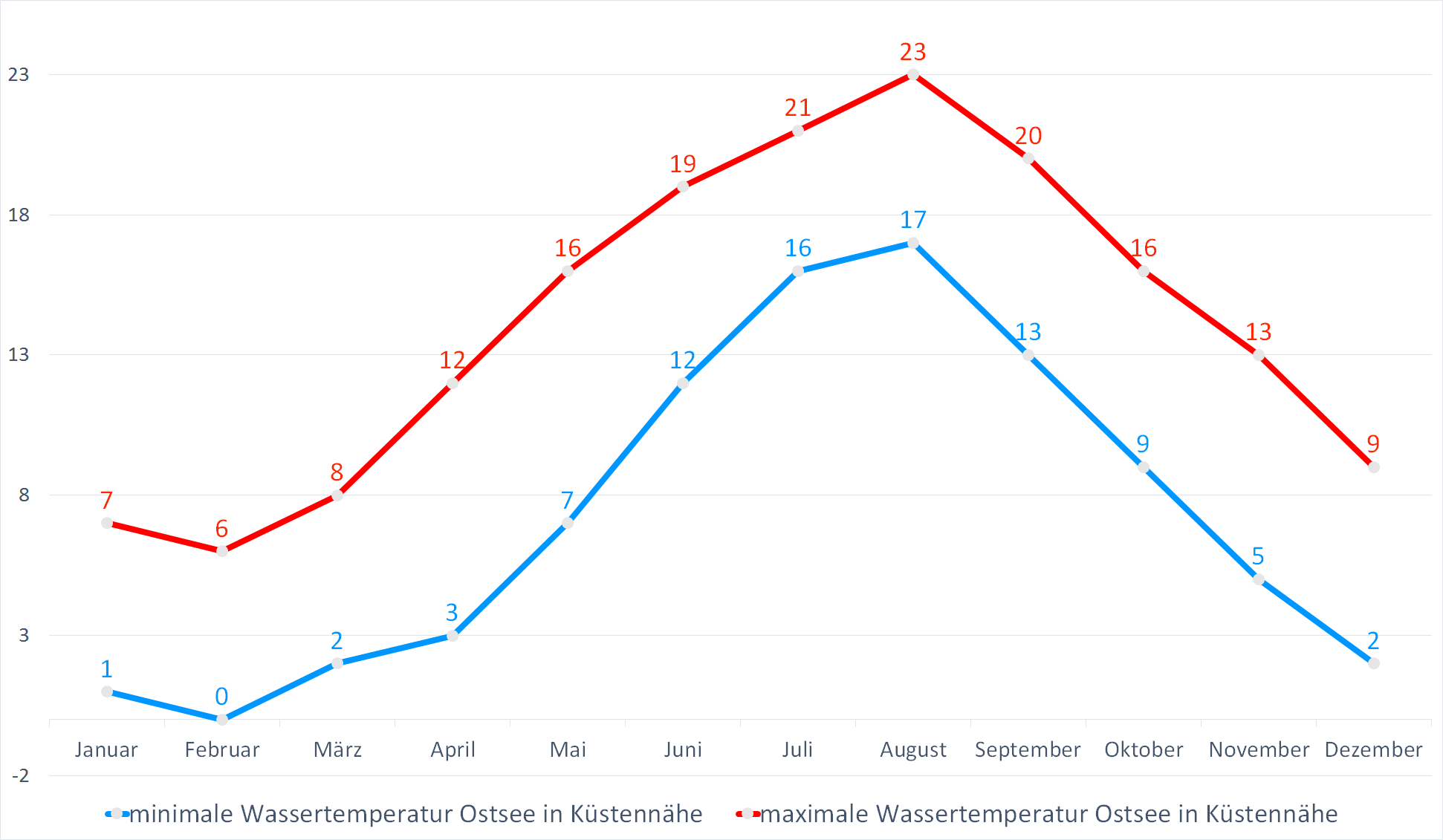 Zur Winterzeit hat das Baltische Meer eine Wassertemperatur von etwa 3 bis 4 Grad. Die Wassertemperaturen steigen jedoch bereits deutlich mit den ersten Sonnenstrahlen im Frühling. Bis Mitte Mai steigen die Wassertemperaturen auf etwa 13 Grad. In unmittelbarer Küstennähe können die Wassertemperaturen jedoch bereits an sehr warmen Tagen Ende Mai bis zu 15 Grad betragen. Im Juli können in Abhängigkeit der Wetterlage (siehe Informationen des Deutschen Wetterdienstes) die Wassertemperaturen durchschnittlich etwa 18 Grad betragen. Im August wird das Wasser in Küstennähe durchschnittlich bis zu 20 Grad warm. In Ufernähe und somit im seichten Seewasser können die Wassertemperaturen der Ostsee im August aber tatsächlich auch bis auf 23 und sogar bis auf 24 Grad anstiegen.