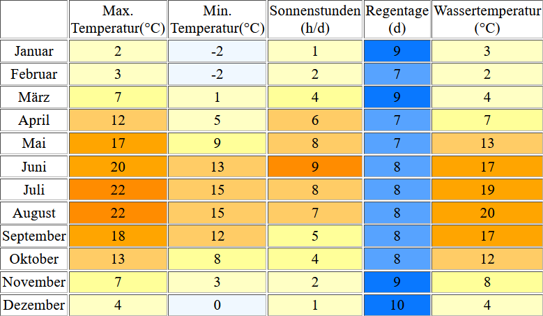 Unterschied zwischen der niedrigsten und der höchsten Wassertemperatur: 24 °C (Februar mit 0 °C zu August mit 24 °C)
