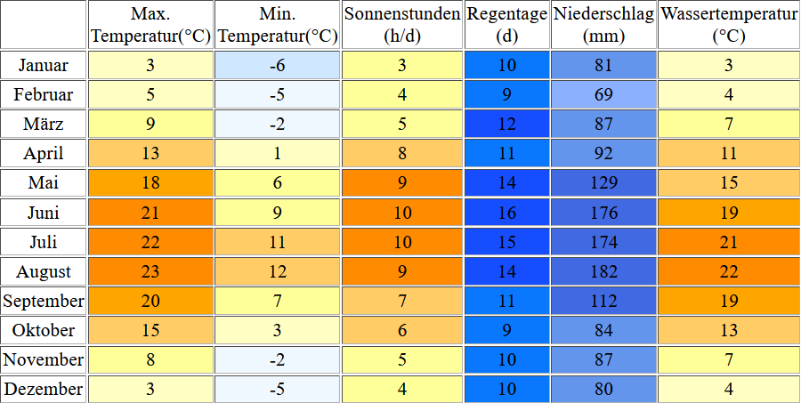 Tabellarische Darstellung der mittleren Wassertemperaturen im Eibsee